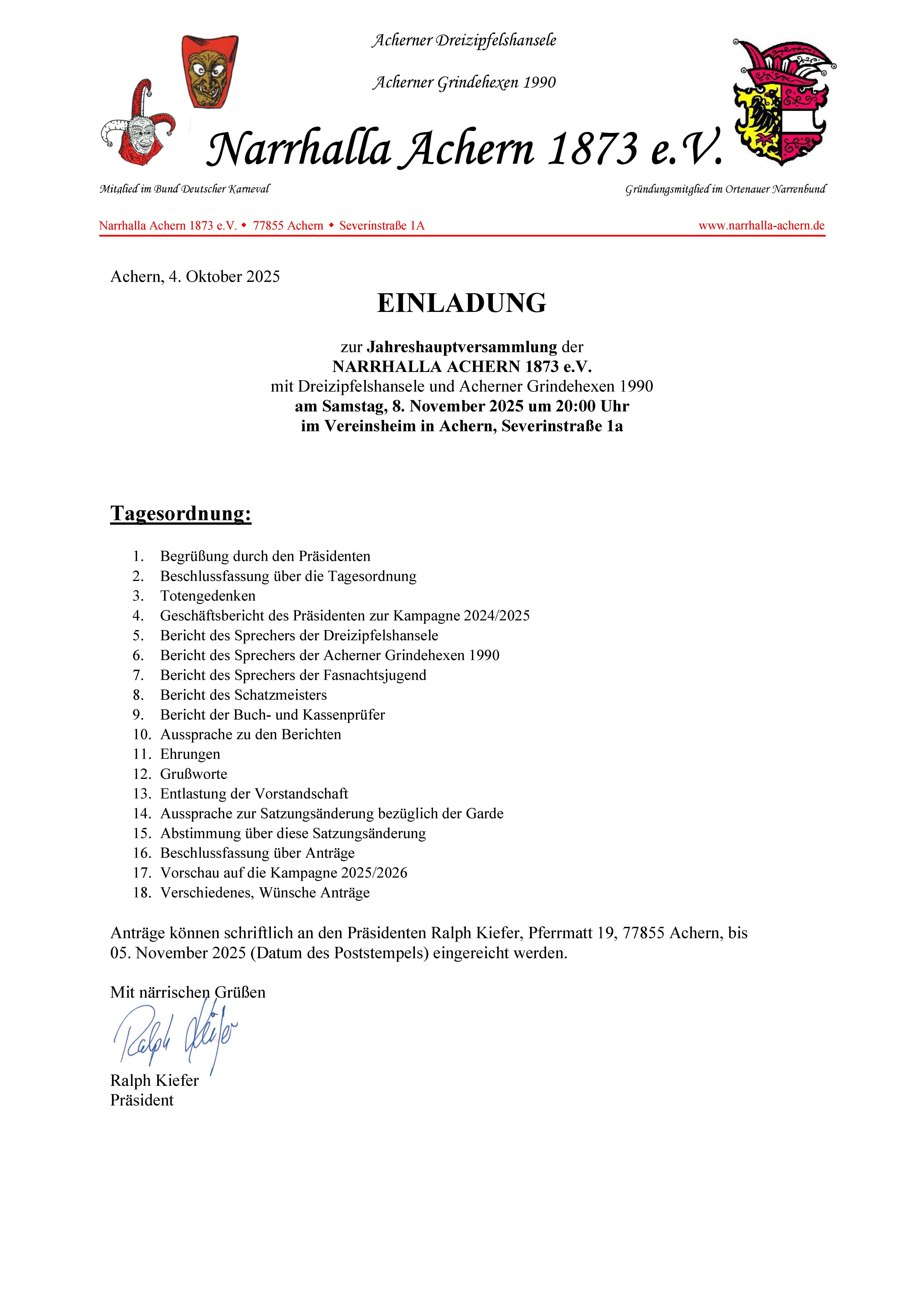 Am Samstag, 8.11. lädt die Narrhalla zu ihrer Jahreshauptversammlung in ihr renovierten Zunftraum ein. Ab 20.00 Uhr sind alle Mitglieder herzlich eingeladen. Anschließend findet die Jahreshauptversammlung des Fördervereins der Narrhalla Achern statt.